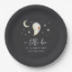 These Halloween baby shower plates from Redwood & Vine Design Co. feature a dark, moody backdrop with a sweet watercolor ghost, crescent moon, and scattered stars. The phrase “a little boo is almost due” adds the perfect playful touch for celebrating an autumn arrival. Ideal for serving cake, snacks, or treats at your spooky-chic baby shower.