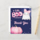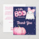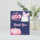 Little boo Halloween girl baby shower thank you card template, navy blue starry night background cute girl baby ghost with a pink hairbow pink pumpkin, Halloween girls baby shower thank you card.