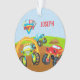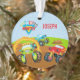 Add a bit of fun to your tree with this cute custom Christmas ornament that has three colourful monster trucks. There is a green monster truck driving through a ring of fire, a red monster truck watching, and a blue monster truck jumping over a dirt pile. There are also chequered racing flags in the top left and your child's first name on the front and the year and a photo on the back.