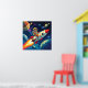 Sci fi poster for a little boy's room featuring a little astronaut flying through space on a rocket ship done in a comic book style retro pop art way.
