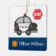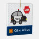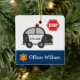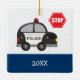 Give your special little police officer his own custom Christmas tree ornament! This ceramic ornament features a large police car, a stop sign, a badge, and your young officer's first name on the front and the year on the back. Behind the police items are soft blue polka dots and a dark blue border. Any young policeman is sure to love this bright and fun holiday ornament!