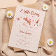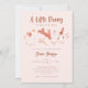 Cute girl's baby shower invitation card featuring bunnies, carrot and flowers. The text says "a little bunny is on the way."