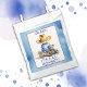 Oh, boy, it's a Lil' Cowboy! Blue and brown baby shower treats featuring a little baby boy in a cowboy hat sitting with a teddy bear, train and baby chick. Country and western themed rustic boy's baby shower.