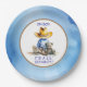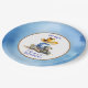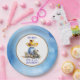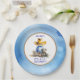 Oh, boy, it's a Lil' Cowboy! Blue and brown baby shower paper plates featuring a little baby boy in a cowboy hat sitting with a teddy bear, train and baby chick. Country and western themed rustic boy's baby shower.