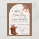 Saddle up and celebrate the upcoming arrival of a little cowboy with this western baby shower invitation. Featuring a warm, rustic brown color palette and whimsical illustrations of cowboy boots, a hat, and a classic rocking horse, it sets the perfect tone for a country-themed celebration. The phrase “A Little Cowboy Is on the Way” is showcased in an elegant mix of serif and cursive typography, adding a charming vintage flair. Overall, this invite captures the spirit of the Wild West while remaining adorable and sophisticated.