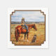 A young cowgirl waits for her dad to catch up so they can begin rounding up the cattle. Their trusty cattle dog sits eagerly watching the herd in the distance while the horse takes this opportunity to doze. Realistic artwork created from an original oil painting by equine and wildlife artist Crista S. Forest.