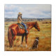 A young cowgirl waits for her dad to catch up so they can begin rounding up the cattle. Their trusty cattle dog sits eagerly watching the herd in the distance while the horse takes this opportunity to doze. Realistic artwork created from an original oil painting by equine and wildlife artist Crista S. Forest.