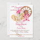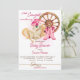 Little cowgirl on the way horses equestrian western farm ranch baby shower invitation template. Cute beige baby horse with a pink cowgirl hat, pink boots, a wheel, pink writing and a robe ribbon. Very nice for horse lovers, easy to make a party theme, mix and match decor.