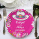 Little cowgirl pink groovy retro boho daisies decorated cowgirl hat baby shower template party plates, bright pink eye catching colours with groovy daisies, retro font