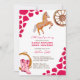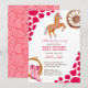 Little cowgirl western rodeo baby shower invitation template instant download. Brown palomino baby horse, a wheel, rope and cowboy boots, cow pattern, western vintage font and modern brush script. Pink colour for a baby girl cowgirl themed baby shower.