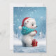 Little cute baby bear with Christmas hat and present.The bear has fluffy fur and big round eyes that sparkle with curiosity and joy. His little paws are lovingly wrapped around the present as if he had just discovered it.