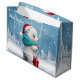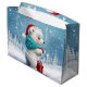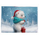 Little cute baby bear with Christmas hat and present.The bear has fluffy fur and big round eyes that sparkle with curiosity and joy. His little paws are lovingly wrapped around the present as if he had just discovered it.