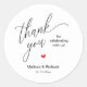Modern Sweet Wedding Minimalist Thank You Gifts Classic favor Round Sticker, in classy handwriting script, cute little red heart, with bride and groom name and date, in black and white.