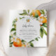 "A Little Cutie is on the Way" baby shower invitation that features bright orange graphics and a modern font. The citrus design is perfect for a gender neutral baby shower.