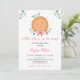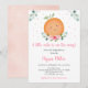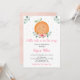 This invitation features watercolor greenery and pink florals with a cute clementine.