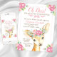 Girl deer baby shower invitations with adorable watercolor fawn deer with pretty pink flowers on her head on a pretty pink floral background. These cute deer baby shower invitations are easily customised for your event by simply adding your details.