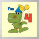 Little Dino 4th Birthday T-shirts, bodysuits, cards, stickers, birthday buttons, tote bags, keepsakes, and other dinosaur 4th birthday apparel and gifts featuring a green smiling dinosaur with balloons, party hat, and a gift!