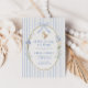 The invitation showcases a soft blue striped background, providing a serene and inviting canvas that evokes the freshness of springtime. At the heart of the design is a hand-painted oval frame, elegantly adorned with an illustration of an adorable duckling nestled among white and blue flowers. This playful and sweet imagery adds a sense of joy and anticipation to your announcement.