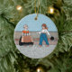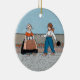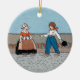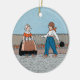 This round hanging ceramic ornament has two little Dutch children, a girl and boy, in traditional Dutch clothing wearing wooden shoes standing in front of a row of red tulip flowers on a blue background. Customise your text on the back with the template.