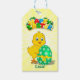Cute baby Easter chicken cartoon with blue eyes, holding a light green Easter egg with little flowers, yellow ribbon and a colourful Happy Easter text on the top.