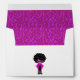Birthday party invitation envelope featuring a fashionable little black girl a with fluffy crochet pink jacket, boots and sunglasses.
