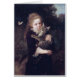 A little grey tabby cat is here with a girl with long blondish hair. There is a butterfly in the picture that the cat wants to see.