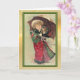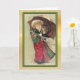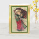 The front of this Holiday greeting card features a vintage fine art image of a little girl dressed in green and red, holding an umbrella and a tiny puppy. Snow falls all around. The image is placed on a light infused gold gradient background, and is bordered in green with a thin gold line.. The inside of the card has the gold background on the left and the other side is white, with text fields for your own message and signature at the bottom. Celebrate Christmas the old fashioned way with this beautiful card showcasing an image from days gone by.