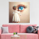 A young girl standing on a ladder wearing an elegant white lace dress wipes a tear from a large, realistic blue eye on a wall