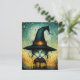 A little girl wearing a witch hat with text "Happy Halloween" postcard.
