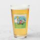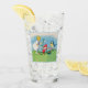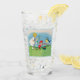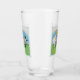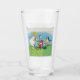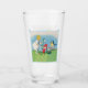This glass tumbler for beverages has a little blonde girl in a white dress with cute little Easter elves in red hats standing beside white lily flowers, coloured Easter eggs and a singing bird in a fancy light blue frame on the front and back.