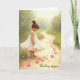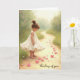 A young girl in a flowing white dress stands barefoot on a winding path, surrounded by pink heart shapes scattered along a pathway.