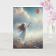 A young girl with long flowing hair holds onto a red balloon in a misty field filled with colourful wildflowers for thinking of you.