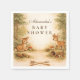A cozy woodland baby shower design inspired by a gentle forest adventure. Illustrated with rustic greenery, pinecones, and a charming “little hunter” clothesline detail, this storybook-style layout feels warm, nostalgic, and nature-loving. Perfect for parents who love the outdoors, woodland themes, or rustic nursery aesthetics.