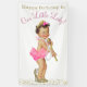 Girls birthday party banner with adorable little lady with pretty tiara dressed in high heels and a string of pearls on a glitter background. You can add the text of your choice and you can add a background colour to this adorable little girl birthday banner.