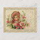Vintage postcard with sweet victorian child in a pink bonnet, with flowers and handwriting on the side, and a neutral damask background.