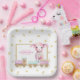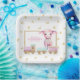 Adorable baby shower plates that are easy to personalise prior to placing into your shopping cart. Cute little lamb with shades of pink stands behind a pink wooden train with gold stars and cherries in the background.