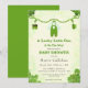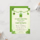 This illustration features an adorable green baby outfit with a shamrock design hanging from a vine of shamrocks. Adding to the charm, cute Leprechaun shoes and a matching hat dangle from the vine. The invitation's corners are adorned with lush mounds of shamrocks, complemented by a subtle backdrop for an elegant touch.