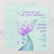 Mermaid birthday invitation with little mermaid under the sea theme. The design features a mermaids tail and ocean bubbles in watercolor shades of purple mint green and turquoise. Easy to edit for any age little girl's birthday party or summer pool party and perfect for mermaid, girly princess and under the sea themes.