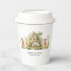 These paper cups feature a soft, inviting design centred around a charming cottage with a thatched roof, nestled among lush greenery and blooming flowers. On either side of the cottage stand two anthropomorphic mice dressed in cheerful orange dresses, surrounded by delicate floral details. The background is a warm beige, giving the overall scene a vintage, storybook feel. The layout is clean and balanced, with space for personalised text, making it ideal for themed celebrations with a whimsical, woodland touch. Personalise with your own information