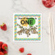 Little Monkeys 1st birthday party paper napkins features three monkeys that are oh so cute, swinging from a tree branch, birthday balloons of yellow and green, text that reads This Lil' Monkey is ONE, and has a wide border of chevron stripes in aqua blue, lime green, orange, brown, and white! We have the matching monkey 1st birthday T-shirts, bodysuits, paper plates, invitations, and more!