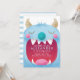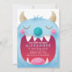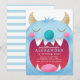 Cute birthday party invitation template for your kid's little monster theme party! Illustration of a blue monster with two horns opening his mouth wide open. The texts are inside the mouth with the party information. Perfect for a toddler's party.