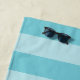 Adorable personalised beach towel for kids features a cute smiling monster illustration sporting a dapper lime green bow tie, on a tone on tone turquoise stripe background. Personalise with a name in lime green.