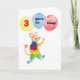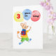 A birthday card for a 3-year old with a handpainted cheeky mouse, holding a gift and balloons with the words '3 years old today! Inside text is 'Happy Birthday'