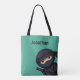 Adorable chubby yet fearsome looking little ninja is dressed in black outfit and carrying katana - traditional Japanese sword.