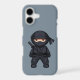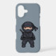 Adorable chubby yet fearsome looking little ninja is dressed in black outfit and carrying katana - traditional Japanese sword.