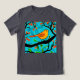 Tee in an Art Nouveau inspired illustration of a little orange and tan bird perched on a branch, with coral orange flower buds, against a soft turquoise textured background