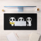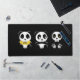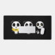 Two little pandas sitting in the dark with a tiny skeleton. One Panda is wearing a yellow tee shirt with the word "meh" on it.
