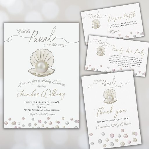 Modern Hand Painted Seashell with Pearl Core and Pearls Decor and Calligraphy script text " A little pearl on the way" Under the Sea Themed Baby Shower