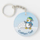 A little penguin cartoon waving in front of a snowball stack. Custom text on both sides.