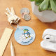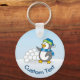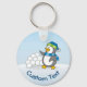 A little penguin cartoon waving in front of a snowball stack. Custom text on both sides.